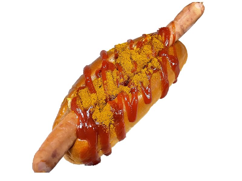 長いウインナーに、ケチャップ、マスタード、カレー粉をかけた、スパイシーなドッグです。